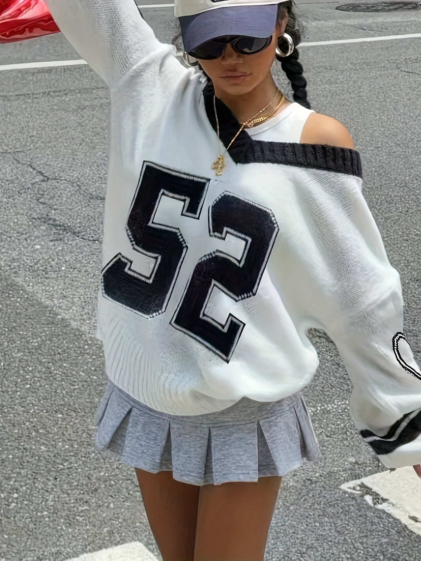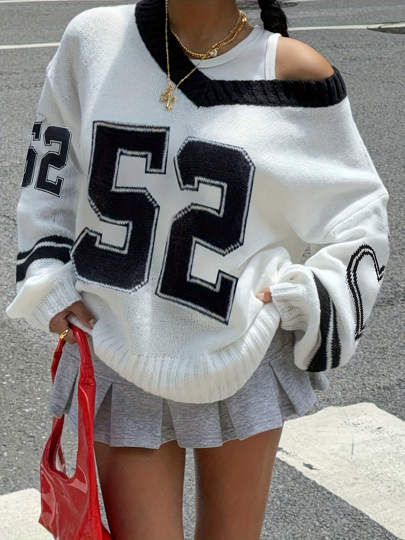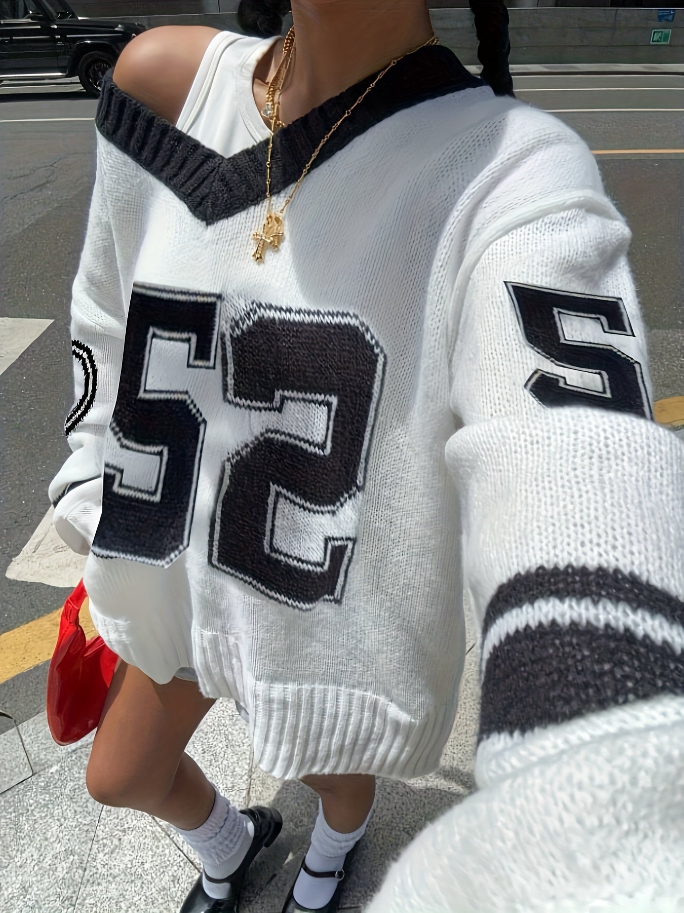Women'S Elegant V-Neck Sweater with Heart Print - Casual Off-Shoulder Pullover, Black & White, Long Sleeve, Ribbed, Perfect for Office, College, or Casual Attire, Casual Attire Sweater | Offshoulder Fashion | Ribbed Texture