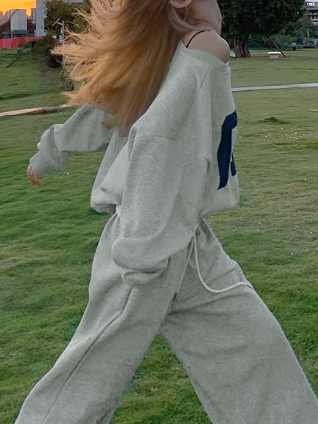 Women'S Fashionable Casual Off-the-shoulder Top and Trousers Two-piece Set, Loose-fitting Geometric Print Trousers, Long Sleeves, Loose Fit, Digital Print, Drawstring Detail, Suitable for Casual Attire, Combining Comfort and Fashion.
