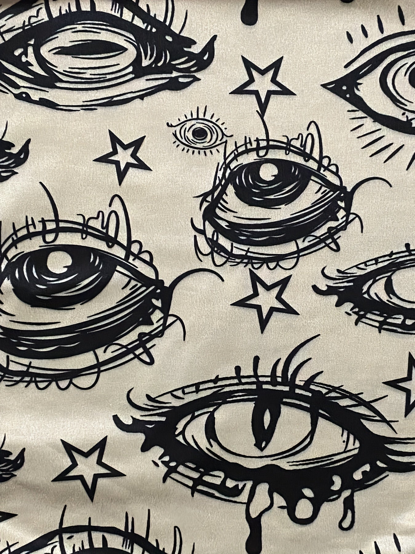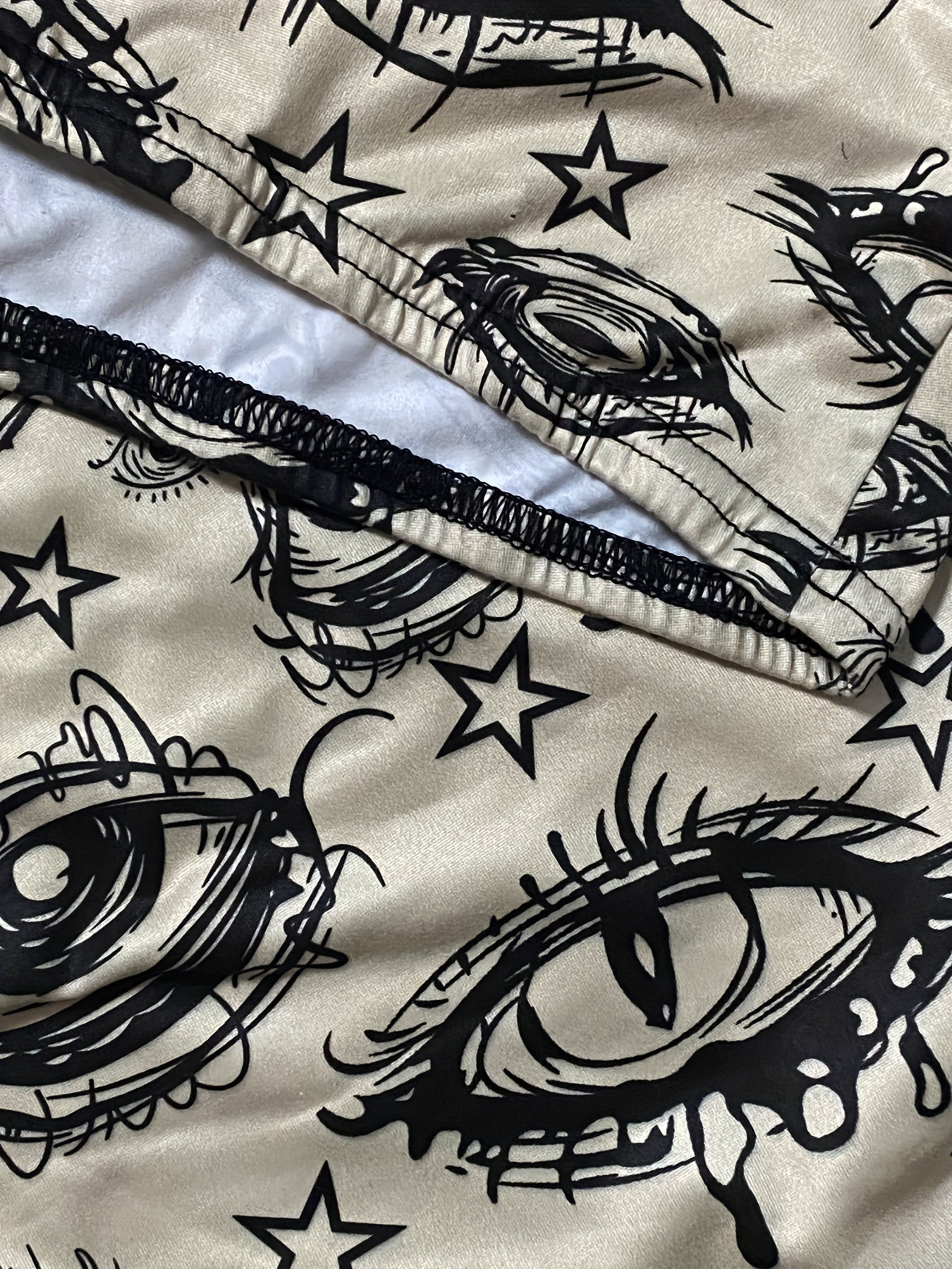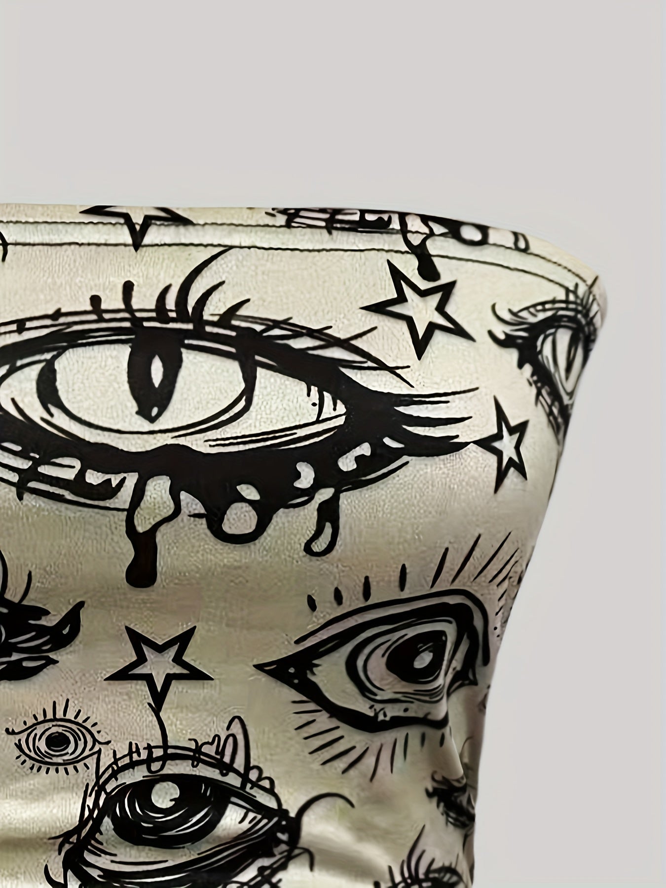 Women's Slim-Fit Off-Shoulder Strapless Top with Eye & Star Print - Stretchy Midriff-Baring Shirt, Machine Washable All-Season Chic Top for Casual & Evening Wear, Versatile Fashion, Eyecatching Design, Stretchy Fabric
